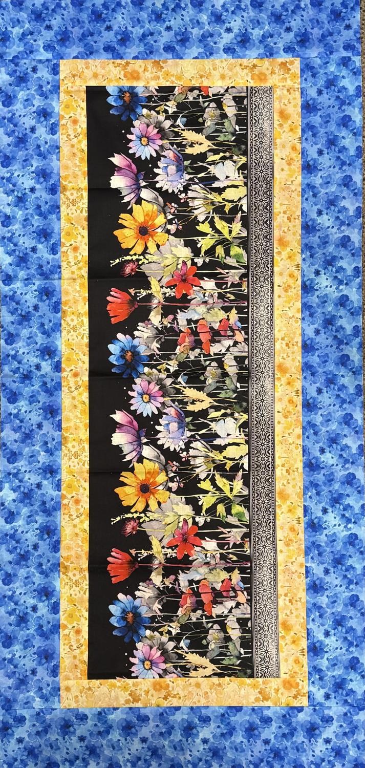 Tablerunner fabric kit featuring Blooming Day & Night floral themed fabric from In The Beginnings. This floral themed table runner kit follows a pattern designed by Tammy from BNP. Cutting instructions are included. Finished size is 17" x 42". Includes all the fabric to make the top, binding, and backing. Backing fabric is included.