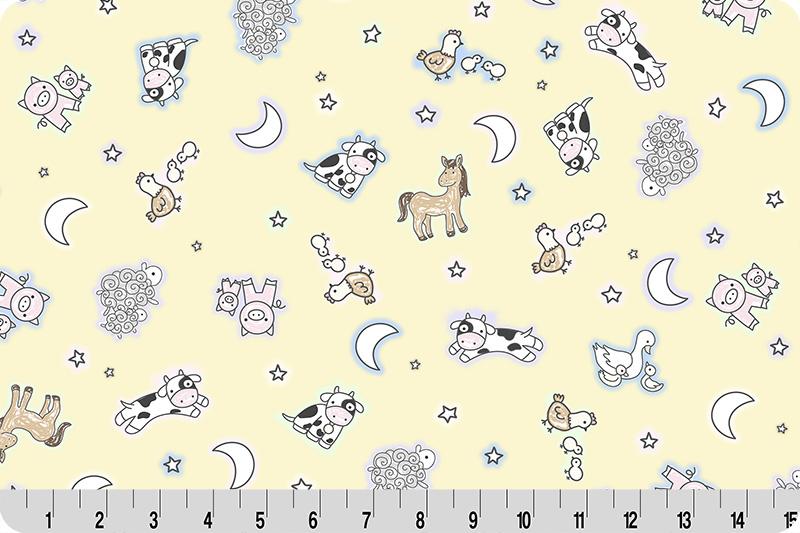 qcgfdreamybarnbutter Goodnight Farm Dreamy Barn Quilting Cuddle® plush minky showcases sweet baby farm animals nestled among soft clouds, twinkling stars, and gentle moons, all rendered in a soothing pastel palette. Printed digitally on a 1.5mm pile fabric, the ultra-soft, low-stretch Quilting Cuddle® minky offers buttery softness without sacrificing stability. Perfect for traditional 1/4" piecing quilts and patchwork projects, small appliqué, clothing, and more. Content: 100% Polyester Width: 43/44" Weight/Linear Yd: 255 grams Pile: 1.5mm Care: Machine Wash Cold with Like Colors; No Fabric Softener; Tumble Dry No Heat: No Dryer Sheet