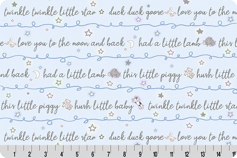 Goodnight Farm Lullaby Quilting Cuddle® plush minky pairs classic bedtime song phrases with gentle stars and adorable baby animals, all rendered in a soft, storybook-inspired palette. Printed digitally on a 1.5mm pile fabric, the ultra-soft, low-stretch Quilting Cuddle® minky offers buttery softness without sacrificing stability. Perfect for traditional 1/4" piecing quilts and patchwork projects, small appliqué, clothing, and more.