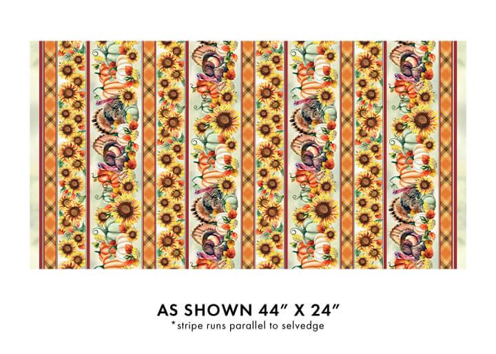 14940-99 Border stripe featuring a row of plaid, a row of sunflowers and a row of Harvest Themed Elements. These stripes repeat 4 times across the width of the fabric Fall is the perfect time to come together and celebrate the season of giving. Give Thanks is filled with all the warm and cozy feelings of autumn,featuring all the season’s classics reinterpreted with a modern sensitivity by Nicole DeCamp. From plaids in classic colors to charming images of softly illustrated leaves, Thanksgiving turkeys, bright sunflowers, and lovely pumpkins...this collection is all about appreciating the simple joys of celebrating the season.