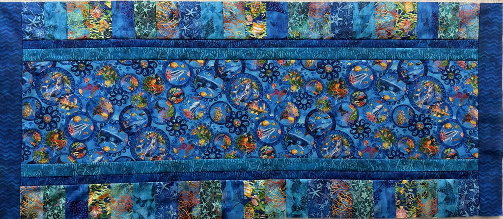 Calypso III is a ocean themed table runner kit featuring the Calypso III collection from In The Beginnings. The fabric kit includes all material to make the top, binding and backing following the Fab-Focus Table Runner pattern (sold separately sku 8024). Finished size is 17" x 40.5".