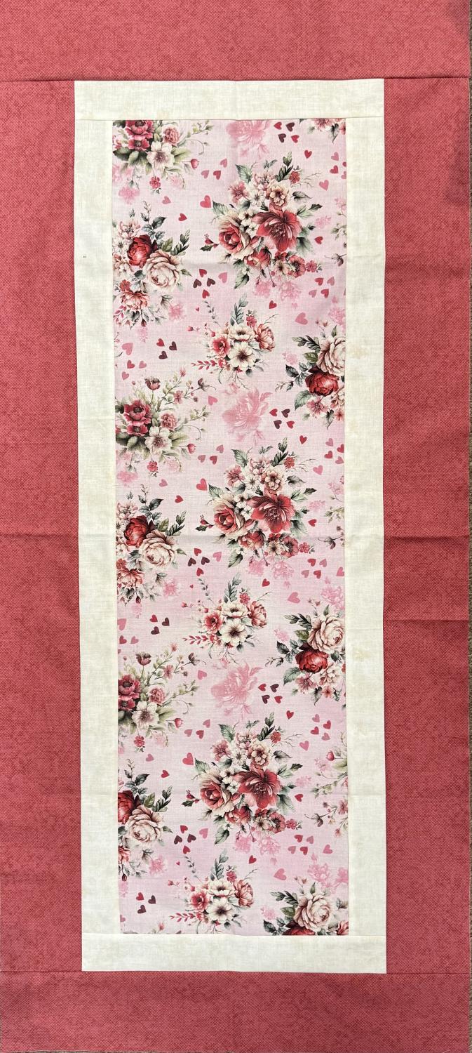 Tablerunner fabric kit featuring the Cupid's Arrow collection from Benartex. This floral (Valentine's) themed table runner kit follows a pattern designed by Tammy from BNP. Cutting instructions are included. Finished size is 17" x 42". Includes all the fabric to make the top, binding, and backing. Backing fabric is included.
