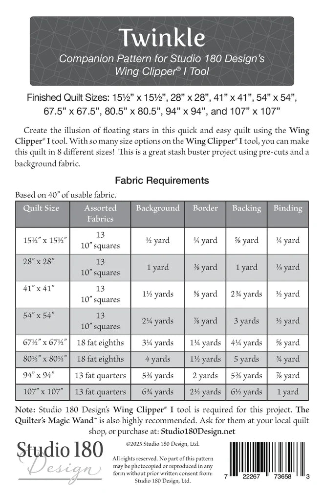 Create the illusion of floating stars in this quick and easy quilt using the Wing Clipper® I tool. With so many size options on your Wing Clipper® I tool, you can make this quilt in a whopping 8 different sizes! Twinkle is a great stash buster project using some pre-cuts and some of that extra background fabric. Pick some fun prints that contrast with your background to create a fun wall hanging or a quilt for your bed, whatever captures your imagination! Details Eight project sizes from 15½” x 15½” to 94” x 94" Required tools: Wing Clipper ® I Fabric: Assorted Brights, background, and border Pattern # SP007